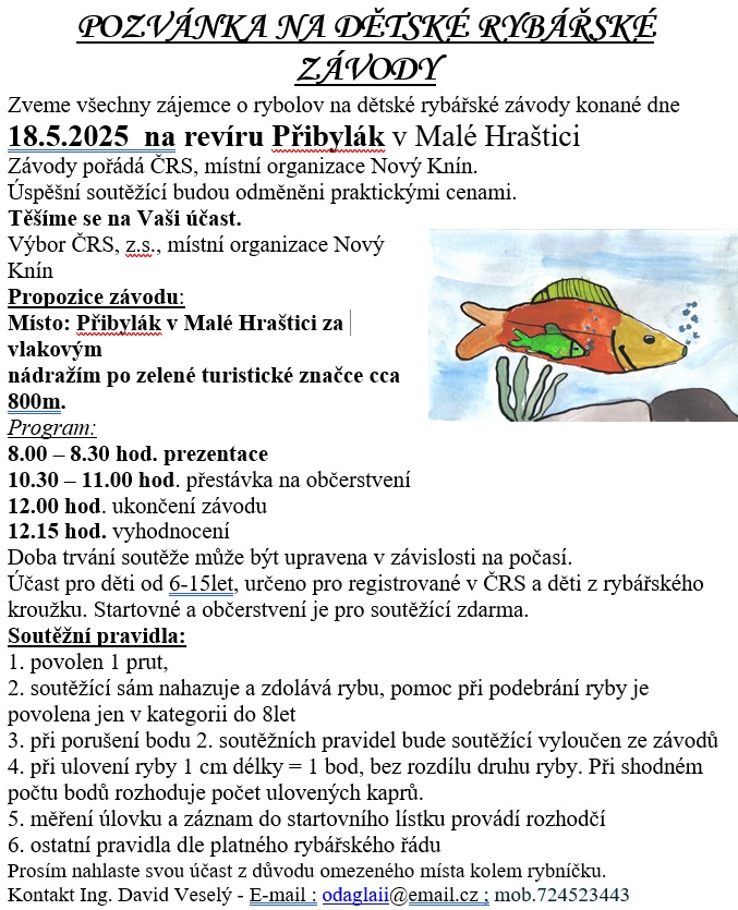 Dětské rybářské závody se uskuteční 18. května 2025 na revíru Přibylák v Malé Hraštici. Závody jsou určeny pro děti od 6 do 15 let, které jsou registrovány v ČRS nebo v rybářském kroužku. Startovné a občerstvení pro soutěžící jsou zdarma. Prosíme o nahlášení účasti. Informace naleznete v pozvánce.